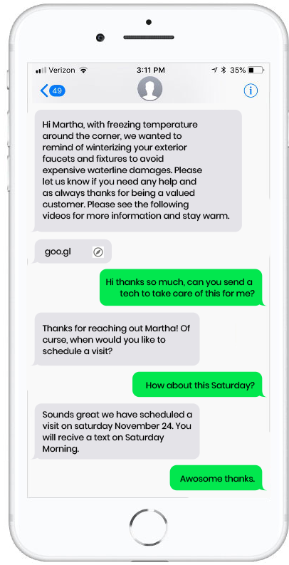 As an example, a home repair and service company can send a marketing/advisory message to all their clients delivering tips to drain their exterior faucets to protect against waterline damage when freezing temperatures are in the forecast